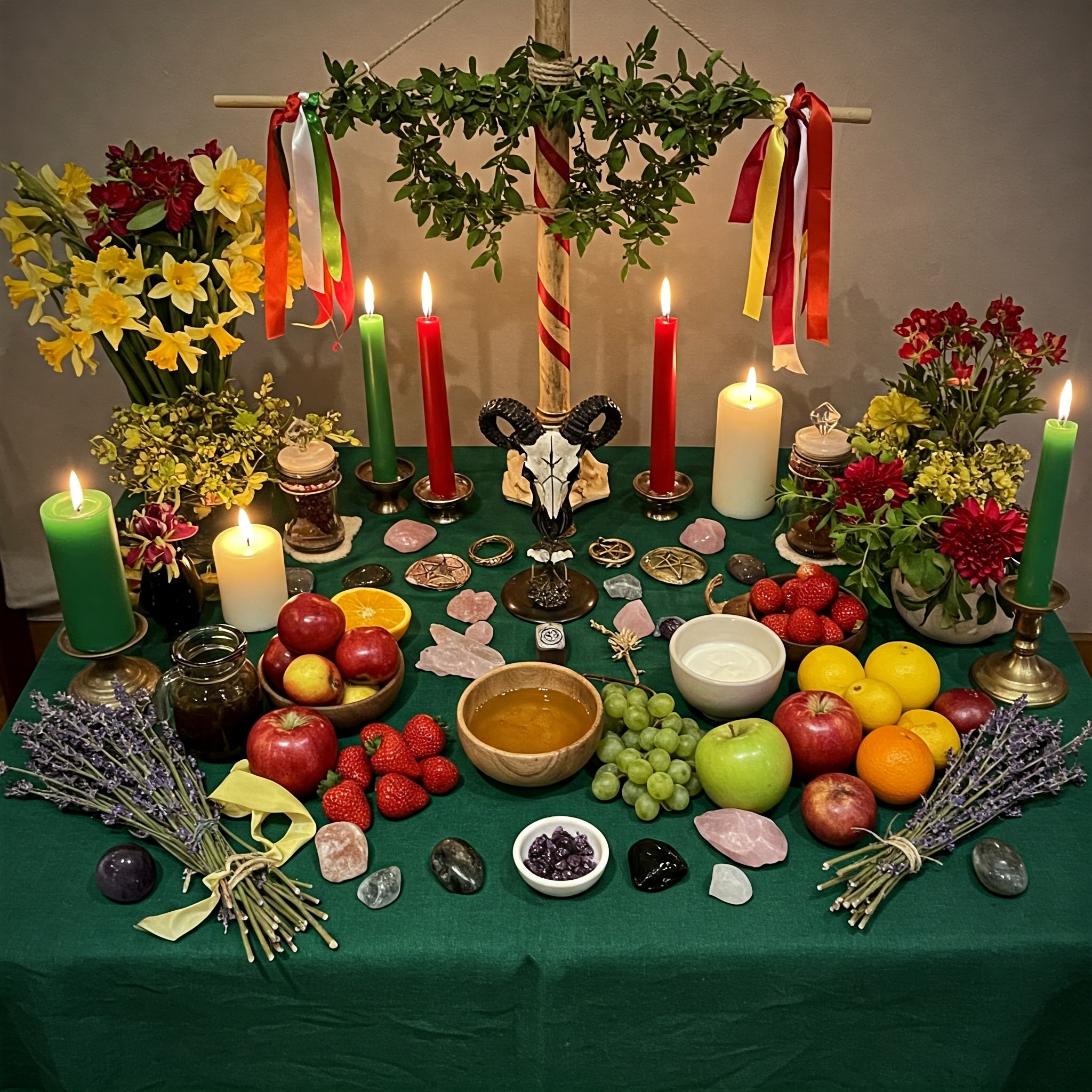 * Symbols of the God and Goddess: A small statue or representation of the May Queen and the Green Man, or symbols like a wand and a chalice.